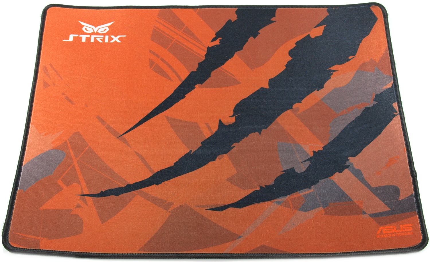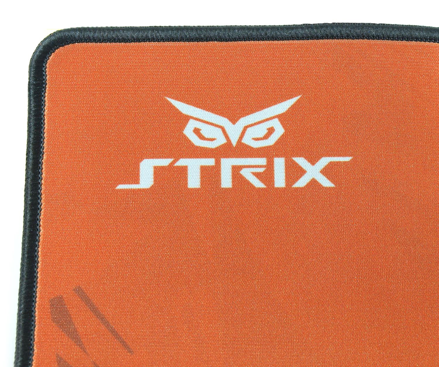 Игровая поверхность ASUS Strix Glide Control выполнена на тканевой основе с мелкоячеистой текстурой из синтетического материала. Внешний дизайн разработчики подчеркнули стилистическими изображениями следов борьбы и когтей. В противоположных углах разместились логотипы компании-производителя и серии.