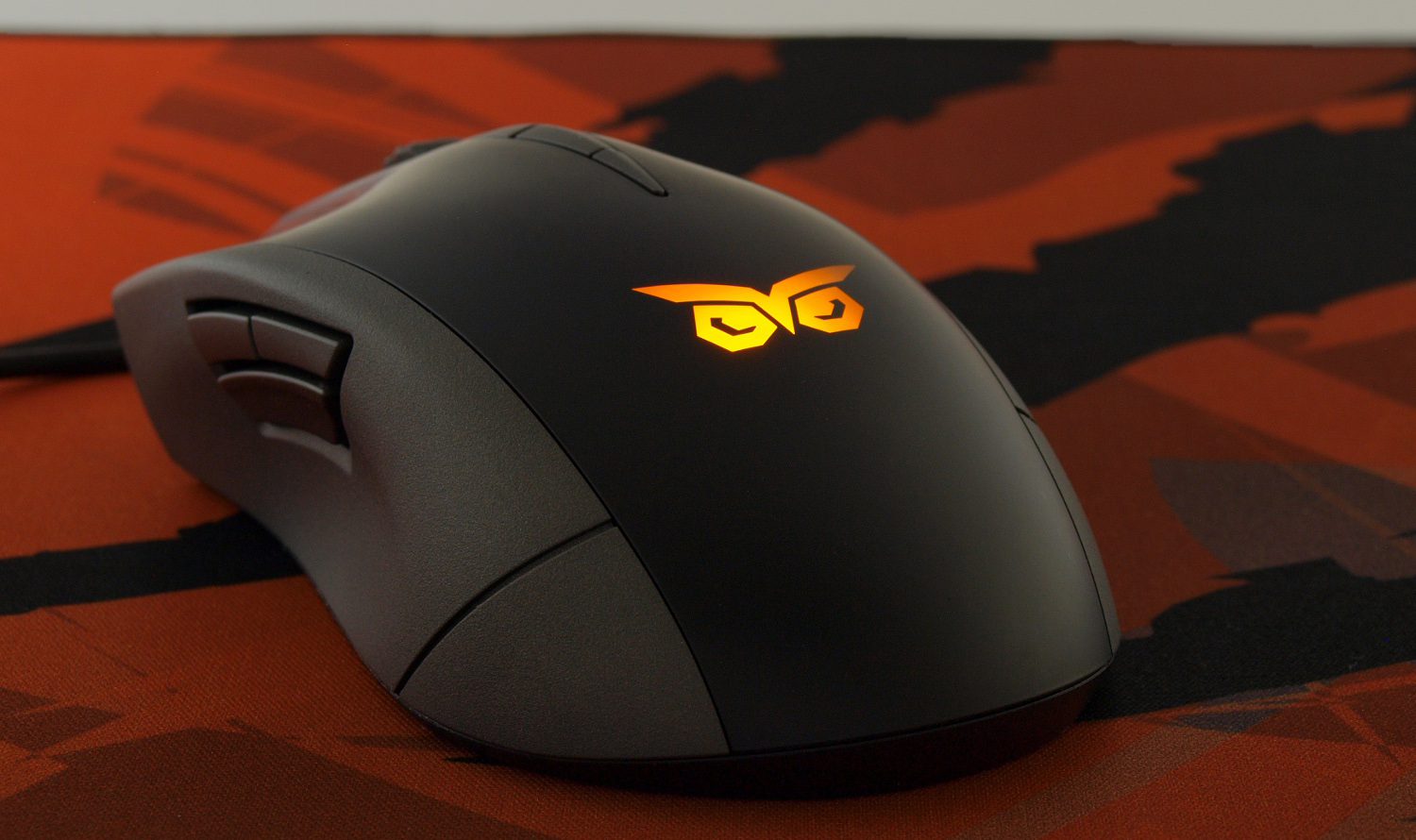 Спинка манипулятора удобно сужена для тыльной части ладони, и здесь же размещен логотип серии Strix. Он, как и колесико, красиво подсвечивается оранжевым цветом.