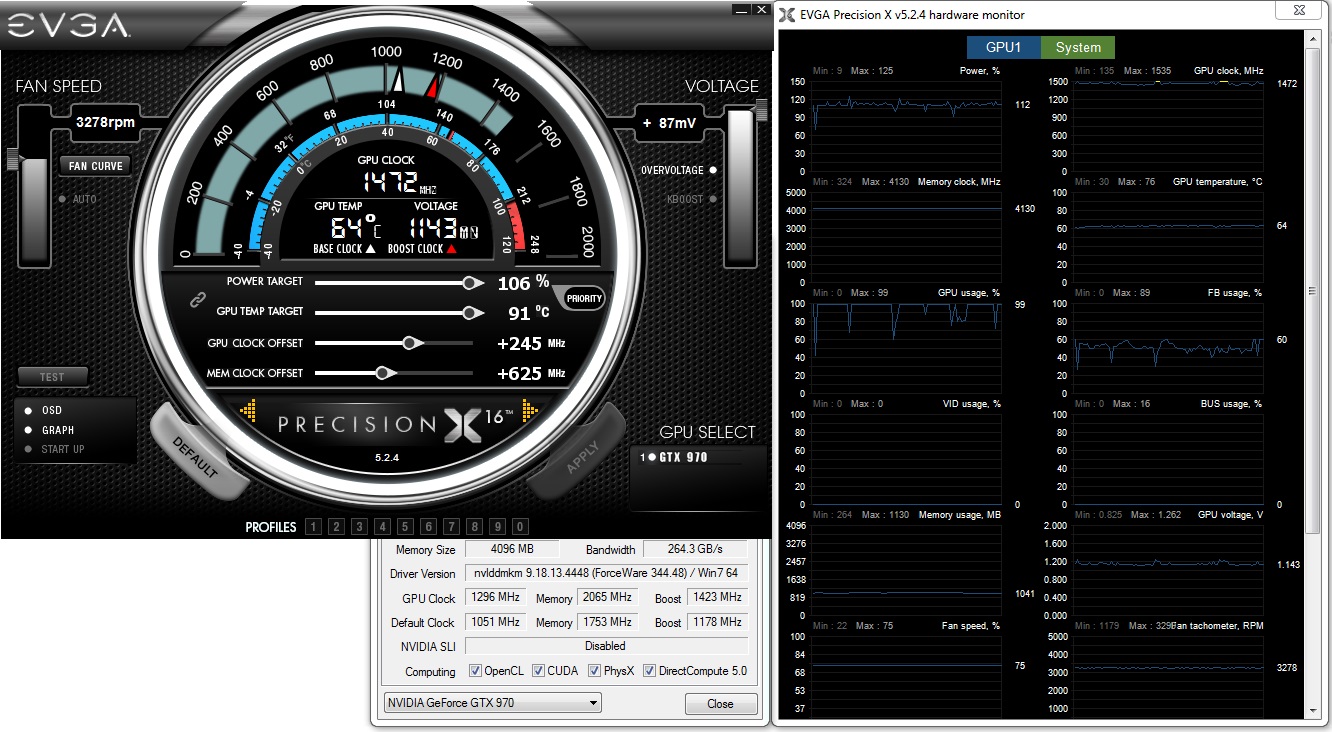 В режиме нагрузки благодаря технологии GPU Boost 2.0 частота видеоядра повышается вплоть до отметки 1266 МГц, и после достижения температурной планки в 73°C начинает снижаться, как и напряжение.