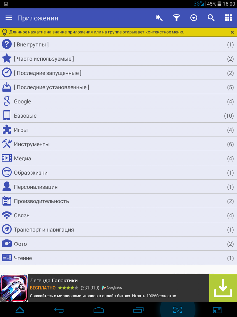 После запуска приложения можно увидеть, что все уже сгруппировано за нас. Экран условно разделен на четыре блока, где в верхнем находятся пока не сгруппированные программы, во втором блоке часто используемые, в третьем и четвертом Glextor AppManager сам решил, куда отнести то или иное приложение. В «инструментах» оказался антивирус, в «связи» – браузер. Что ж, все верно.