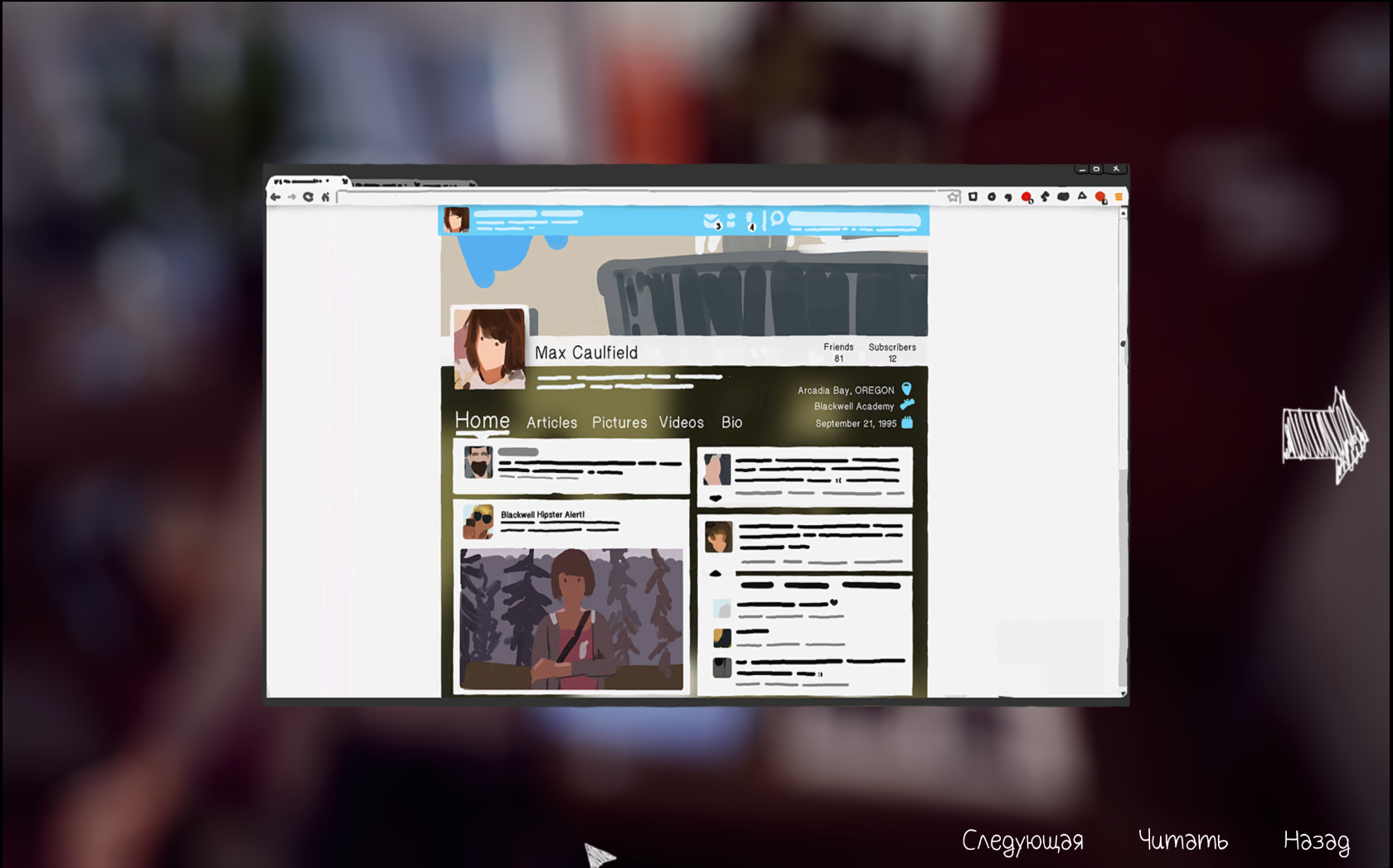 К примеру, после столь странного происшествия Максин решает, как можно быстрее уйти с урока, дабы предотвратить трагедию. Однако весьма хипстерского вида преподаватель по фотографии (в Life is Strange тема хипстеров раскрыта более чем полностью) задает каверзный вопрос, ответа на который она в своей голове не находит.