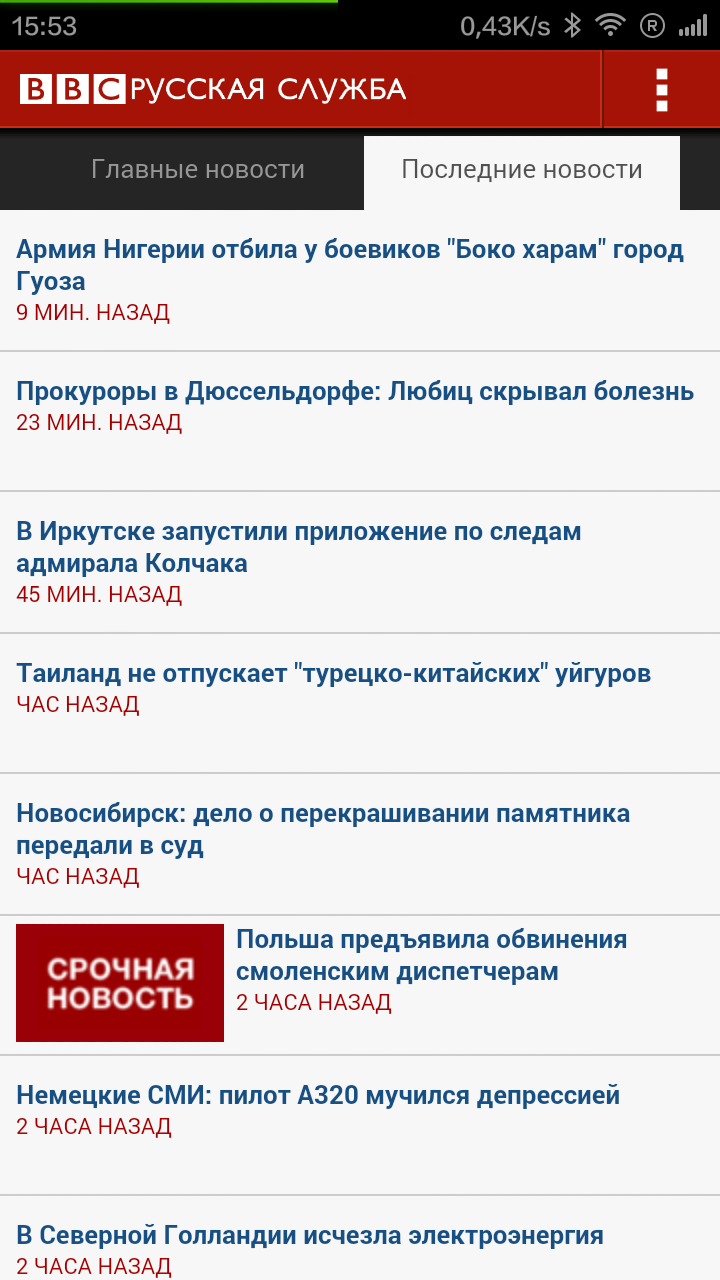 Затем есть вторая вкладка – «Последние новости». Как вы поняли, на основном экране в новостях нашей страны размещаются самые посещаемые публикации. А вот все остальные в хронологическом порядке идут в этой вкладке. Мы видим название и время, спустя которое была размещена статья.