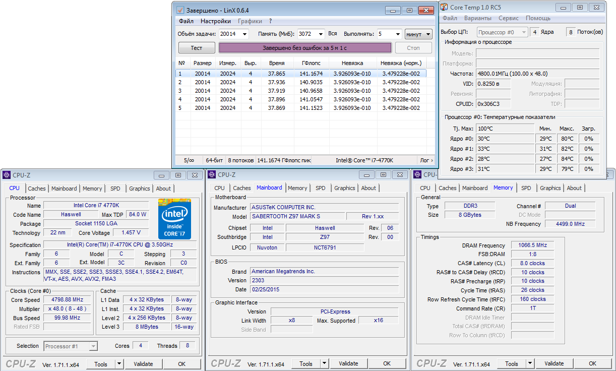 Результат разгона, достигнутый с ASUS Sabertooth Z97 Mark S, составил 4800 МГц: