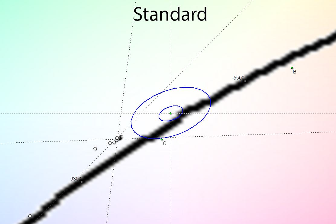 Для получения яркости 100 нит, цветовой температуры белой точки в 6500K и прочих улучшений в Standard Mode были выставлены следующие настройки: