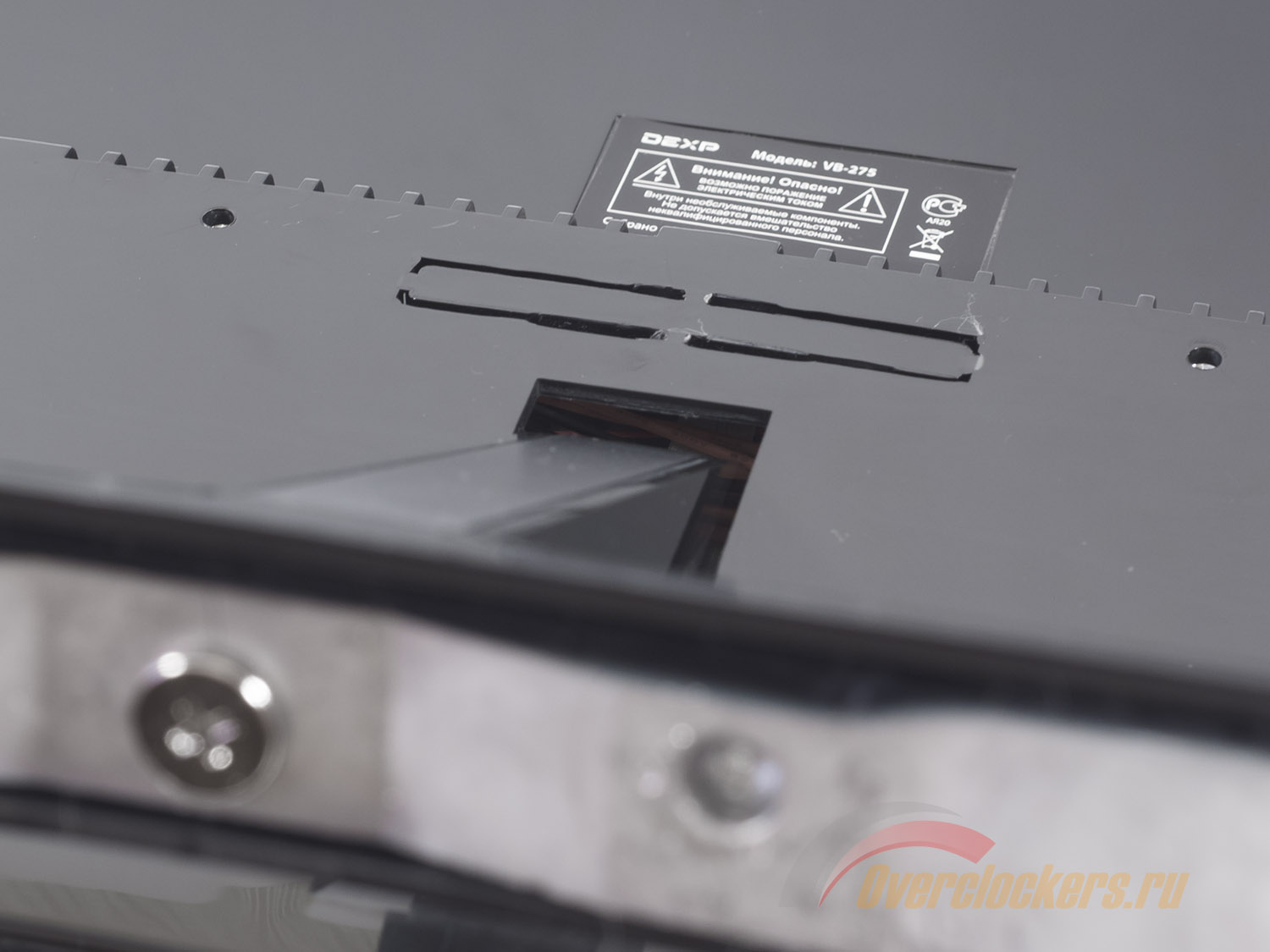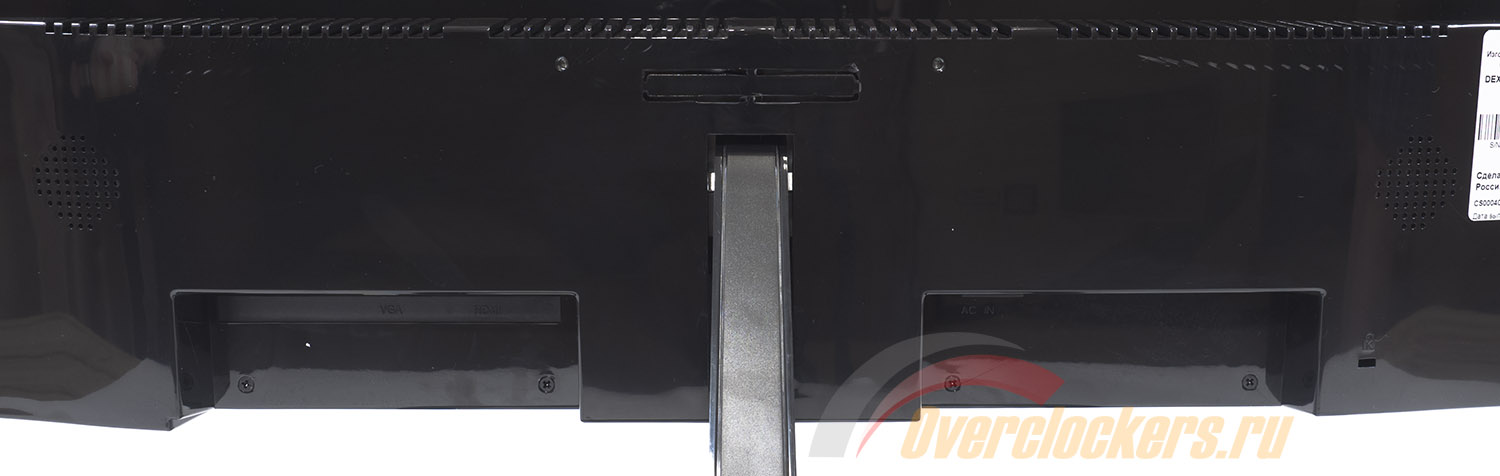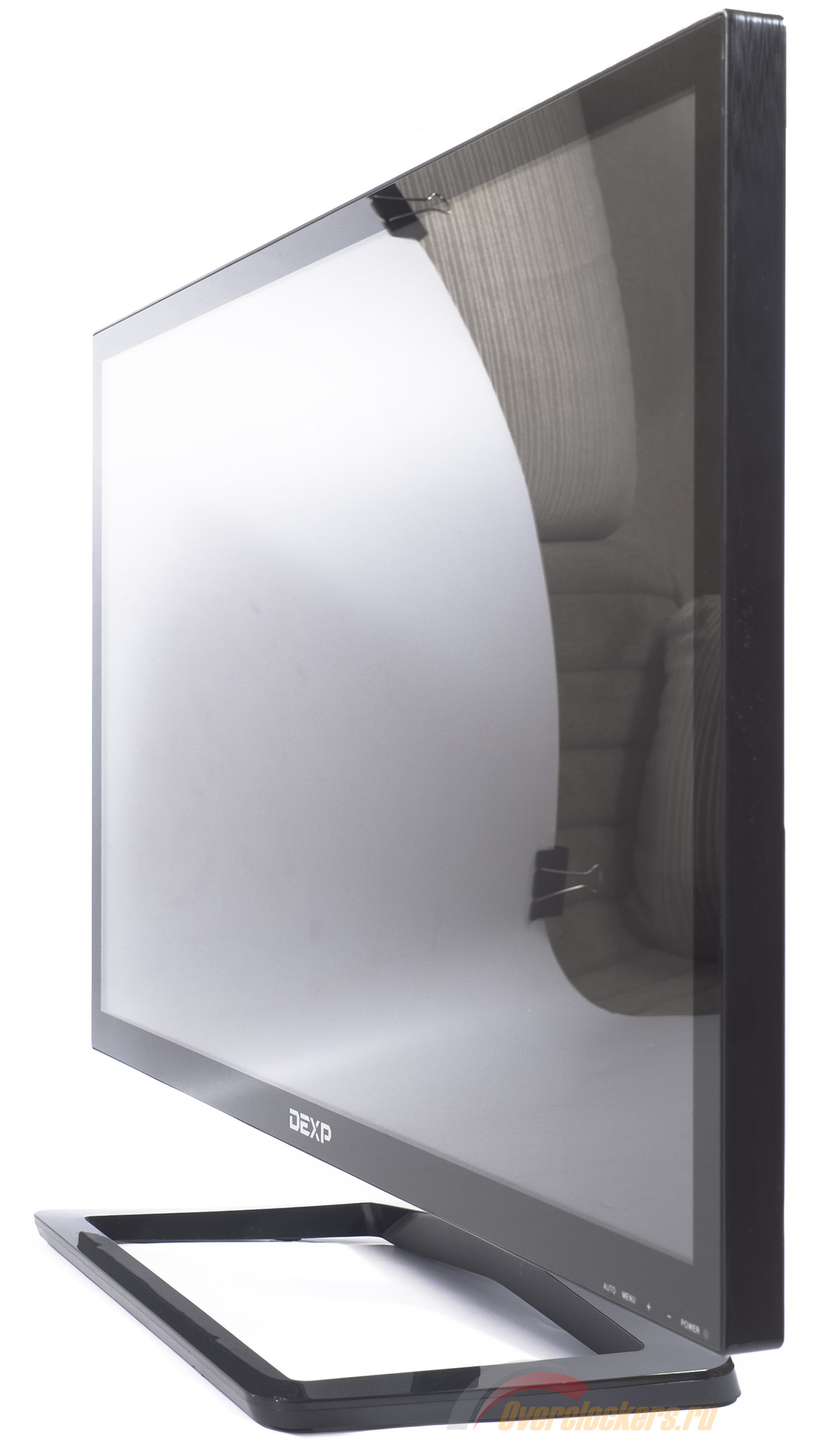 Дизайн DEXP VB-275 стандартен: большой черный корпус со стеклянной поверхностью спереди и фигурная подставка со свободным пространством внутри.