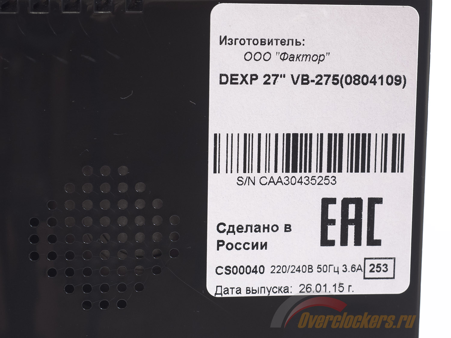 На упаковке присутствует одна заводская наклейка, по которой можно узнать различные номера (серийный, номер партии и прочее), наличие разъемов подключения, страну производства (Россия) и прочие несущественные данные. Наш экземпляр дисплея выпущен 26 января 2015 года и попал в лабораторию Overclockers.ru непосредственно из представительства компании во Владивостоке. Именно поэтому коробка настолько сильно «искалечена» скотчем курьерской службы и прочими стикерами.