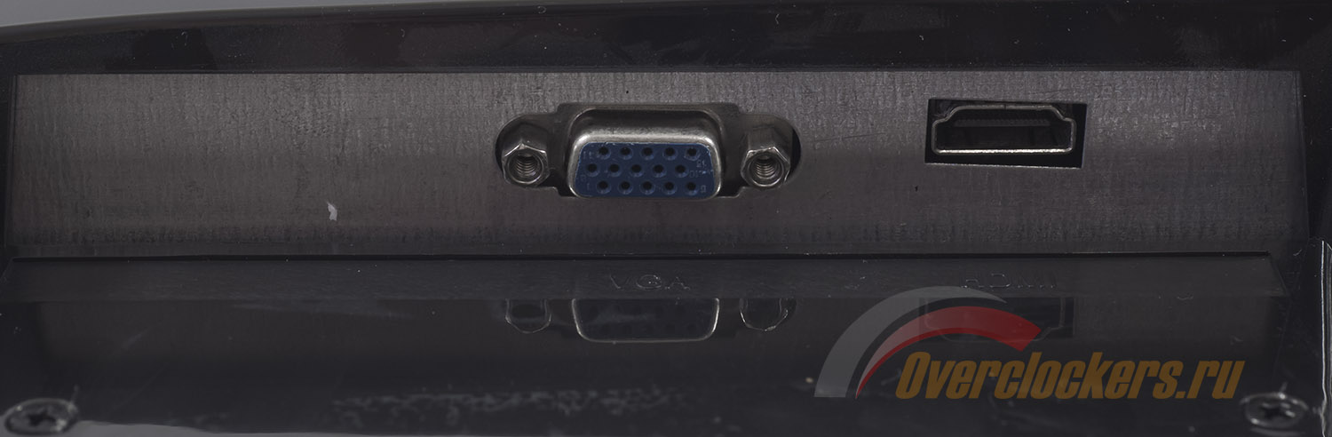 В задней части монитора на колодке для подключения кабелей находятся следующие разъемы, ориентированные вниз: питание, аналоговый D-Sub и цифровой HDMI.