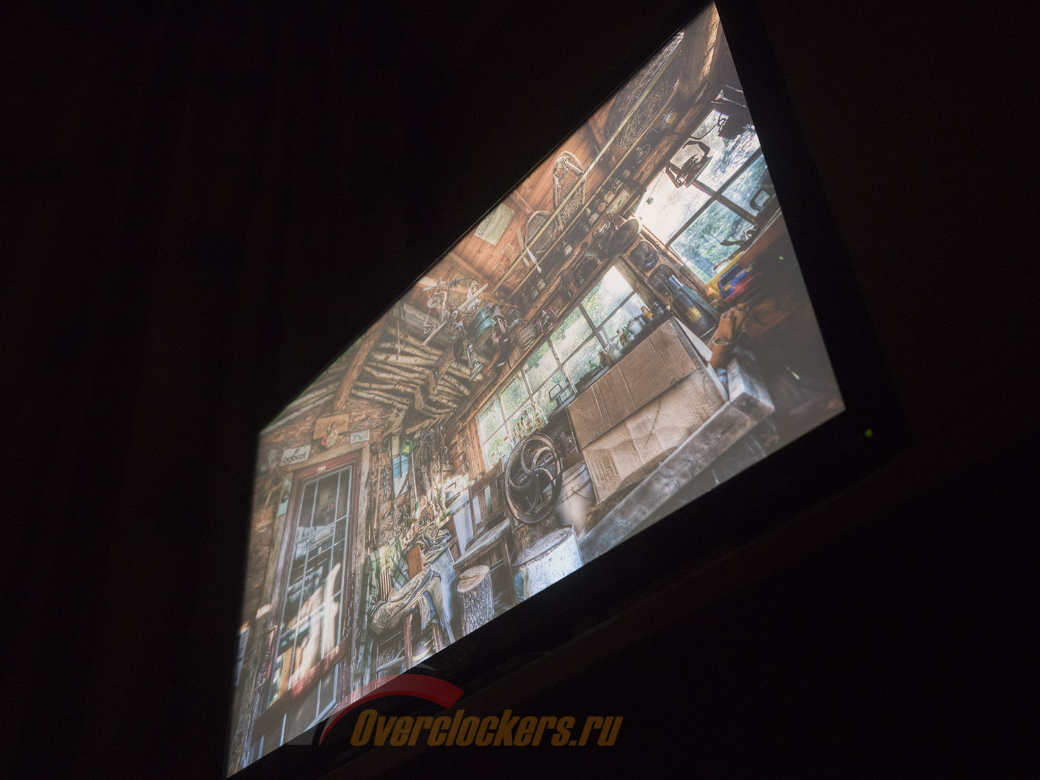 При диагональных углах обзора наблюдается заметное снижение контрастности, изображение покрывает этакое хорошо заметное белое облако с легким оранжевым налетом. При просмотре снизу этот эффект проявляется не так сильно, но при этом картинка становится несколько темнее, особенно в тенях.