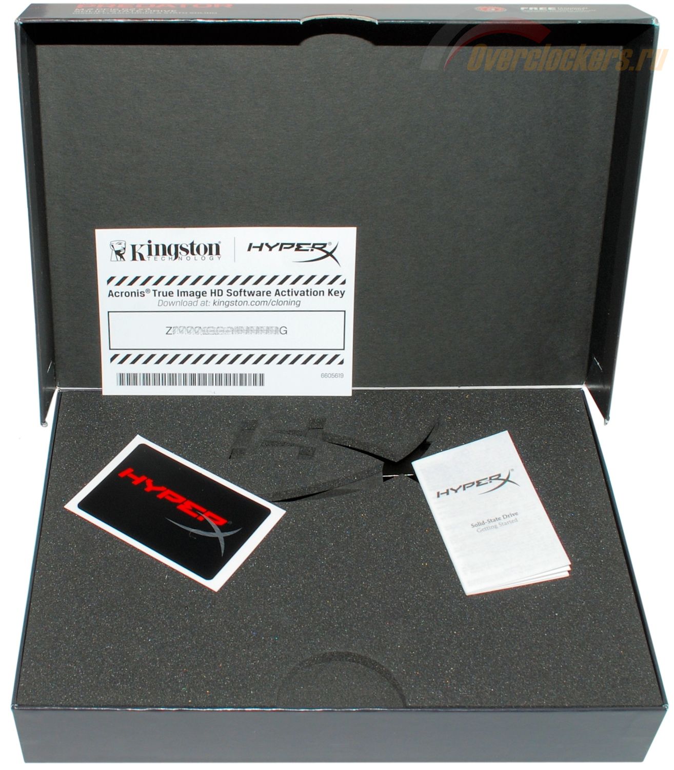 Помимо самого устройства и инструкции по установке, в коробку вложены наклейка на корпус системного блока, карточка с лицензионным ключом к программе резервного копирования и переноса данных Acronis True Image, а также дополнительная планка-заглушка для установки HyperX Predator в низкопрофильные системные блоки.