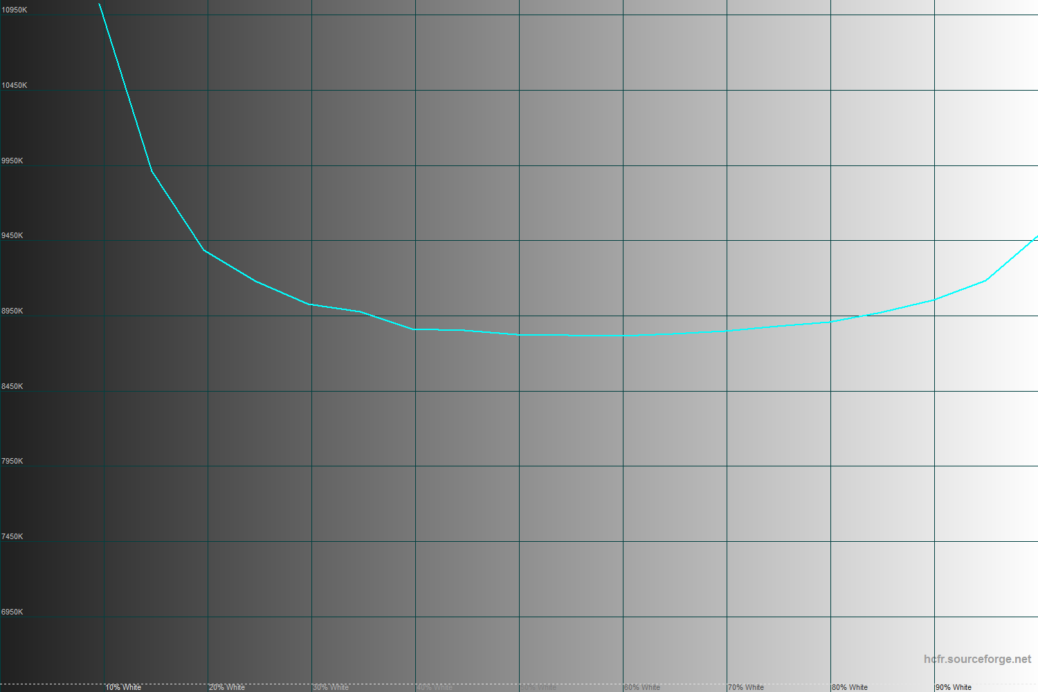 Цветовая температура ведет себя относительно стабильно. Но в среднем значении она приближена к 9000К и далека от референсных 6500К. Изображение будет холодить.
