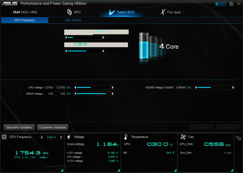 Затем заходим в BIOS и переключаем Ai Overclock Tuner в Manual. После этого частоту BCLK вручную ставим равной 100 МГц. Сохраняем настройки и перезагружаемся. После этого снова заходим в BIOS материнской платы и поднимаем частоту BCLK до 105-107 МГц – той частоты, на которой материнская плата еще может загрузить операционную систему. Загружаемся в Windows и затем по одному мегагерцу начинаем поднимать частоту через ASUS AI Suite III, на закладке TurboV EVO.
