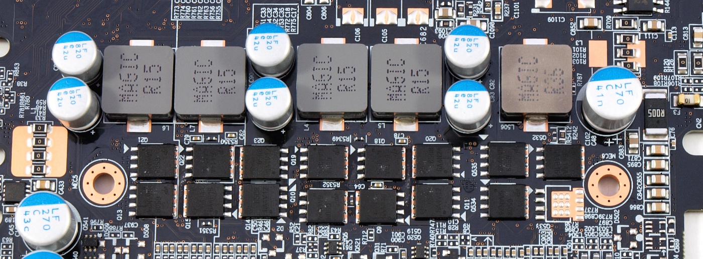 Элементная база соответствует концепции Ultra Durable VGA, она набрана исключительно из качественных комплектующих: японских твердотельных конденсаторов, дросселей с ферритовым сердечником и полевых транзисторов.