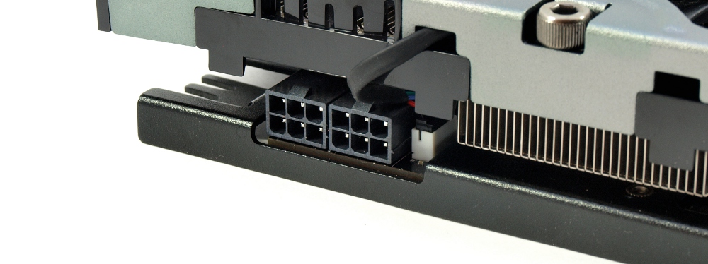 Дополнительное питание реализовано с помощью двух шестиконтактных разъемов на краю печатной платы. Значение TDP производитель приравнял к 145 Вт, что сопоставимо с эталонной версией. К минусам можно отнести расположение защелок вблизи с кожухом СО, что затрудняет отключение проводов.