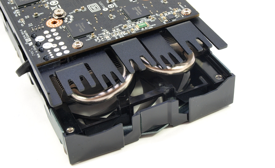 Инженеры использовали три тепловых трубки, из которых две 8 мм и одна центральная 6 мм. Они полностью накрывают графический процессор.