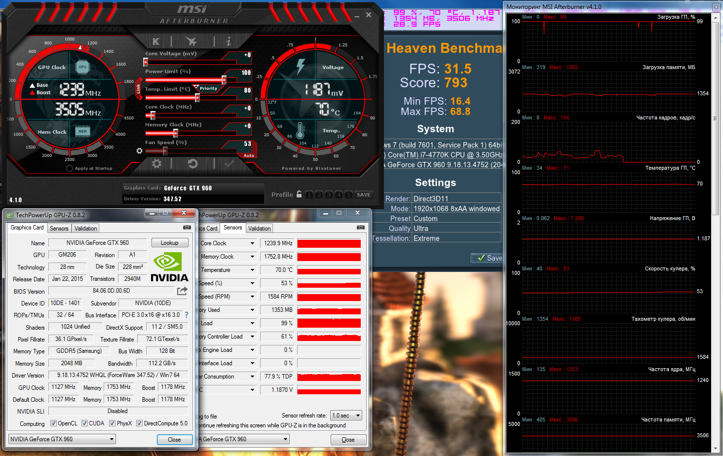 Снова обратимся за помощью к Heaven Benchmark v 4.0, чтобы сымитировать повседневные игры. В режиме GPU Boost достигается частота ядра 1405 МГц – это высокое значение, но в сети есть результаты и покруче: по-видимому, дело в прошитой на данном экземпляре версии BIOS, приходится мириться с этим.