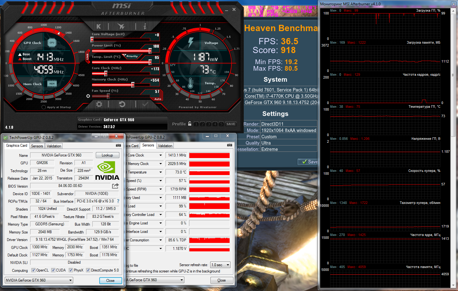 Для разгона видеокарт, а также мониторинга температур и оборотов вентиляторов использовалась фирменная утилита MSI Afterburner v4.1.0.