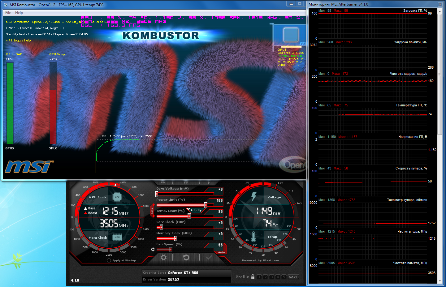 Стоит проверить систему на эффективность охлаждения более агрессивной средой – MSI Kombustor 2.5. В этом случае алгоритмам, заложенным в BIOS модели Inno3D GeForce GTX 960 HerculeZ X1, приходится вмешиваться более решительно, чтобы не провалить испытание.