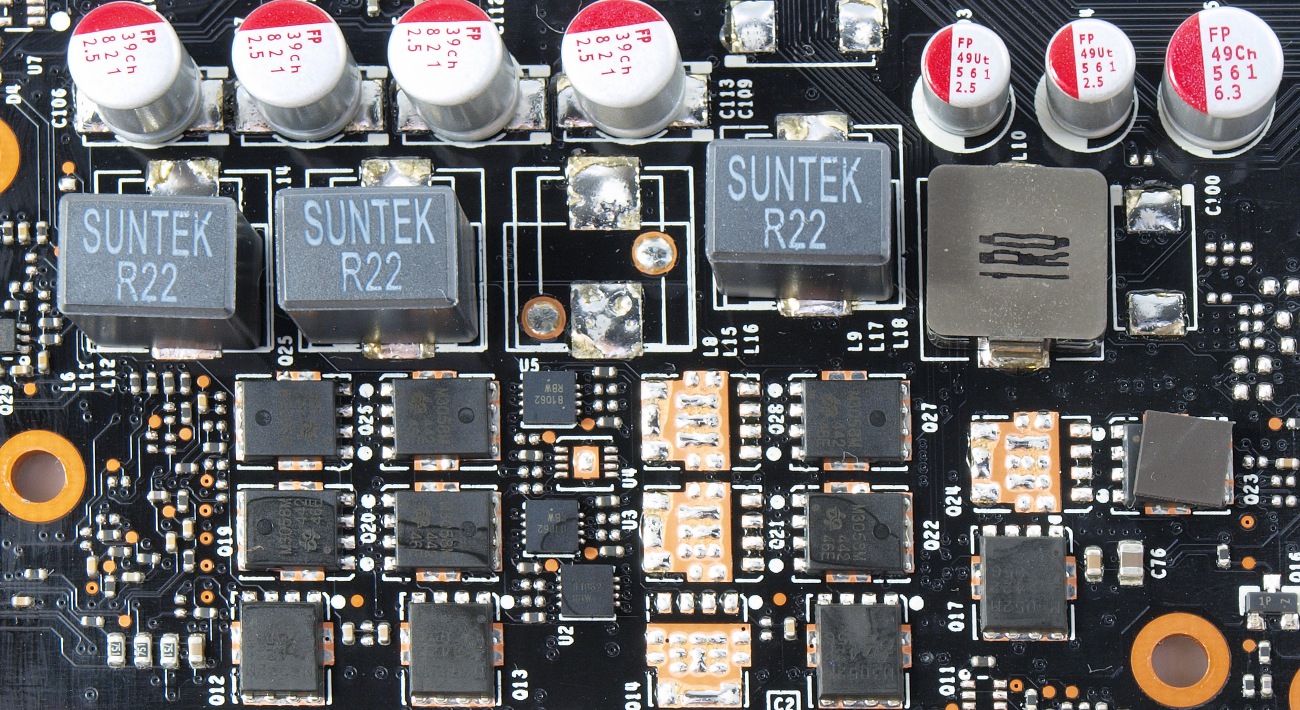 Скорее всего, инженеры разработали данную PCB с нуля с привычным расположением ключевых компонентов и применением качественной элементной базы с твердотельными конденсаторами и дросселей с ферритовым сердечником.