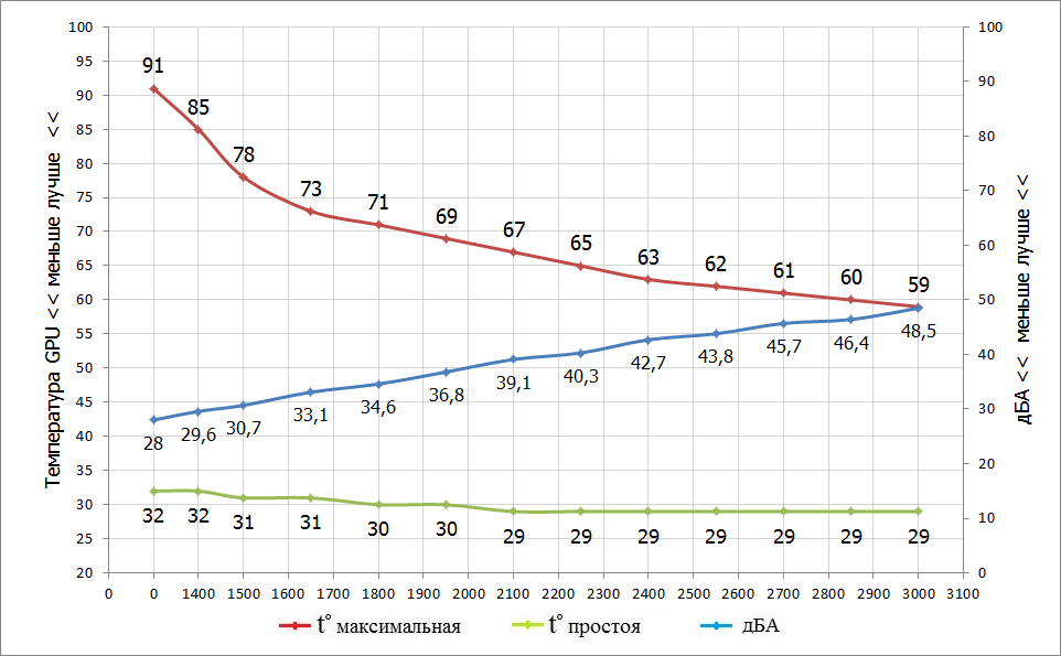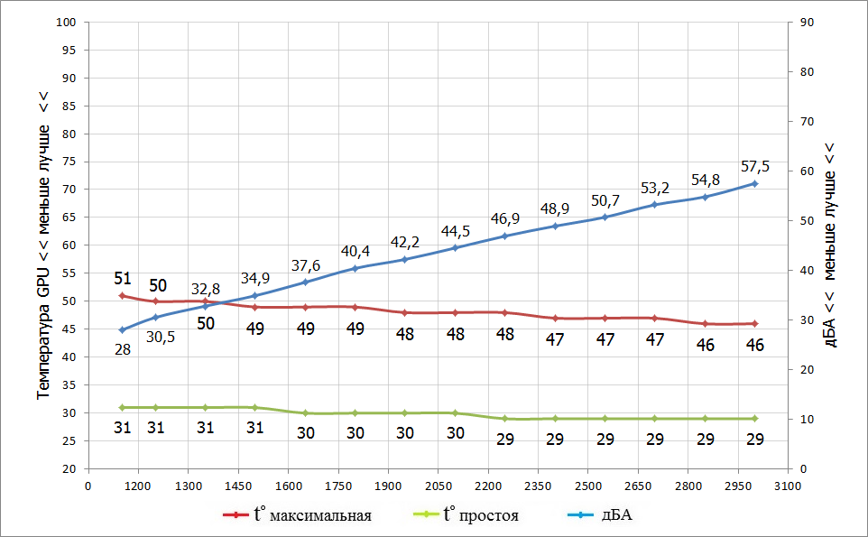 При 1300 об/мин и ниже температуры графического процессора и подсистемы питания становились критическими; тест решено было остановить.