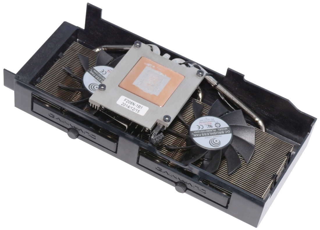 Под пластмассовым кожухом прячется очередной пример применения технологии прямого контакта: две тепловые трубки диаметром 8 мм каждая идеально подошли, чтобы накрыть графический процессор GM206 полностью.