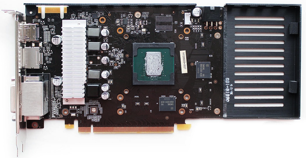 Не забыли инженеры и о силовой части видеокарты и микросхемах видеопамяти, накрытых единой металлической пластиной без оребрения.