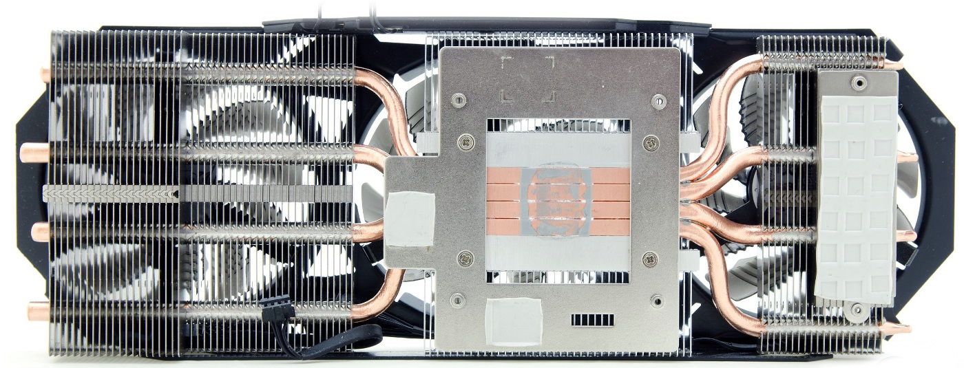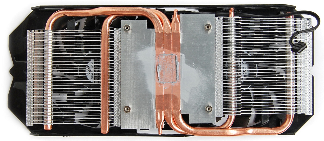 С графическим процессором контактирует широкое никелированное основание, технология прямого контакта отсутствует. В качестве основного охладителя представлен двухсекционный радиатор, набранный из 72 никелированных алюминиевых пластин, пронизанных двумя 6 мм тепловыми трубками U-образной формы.