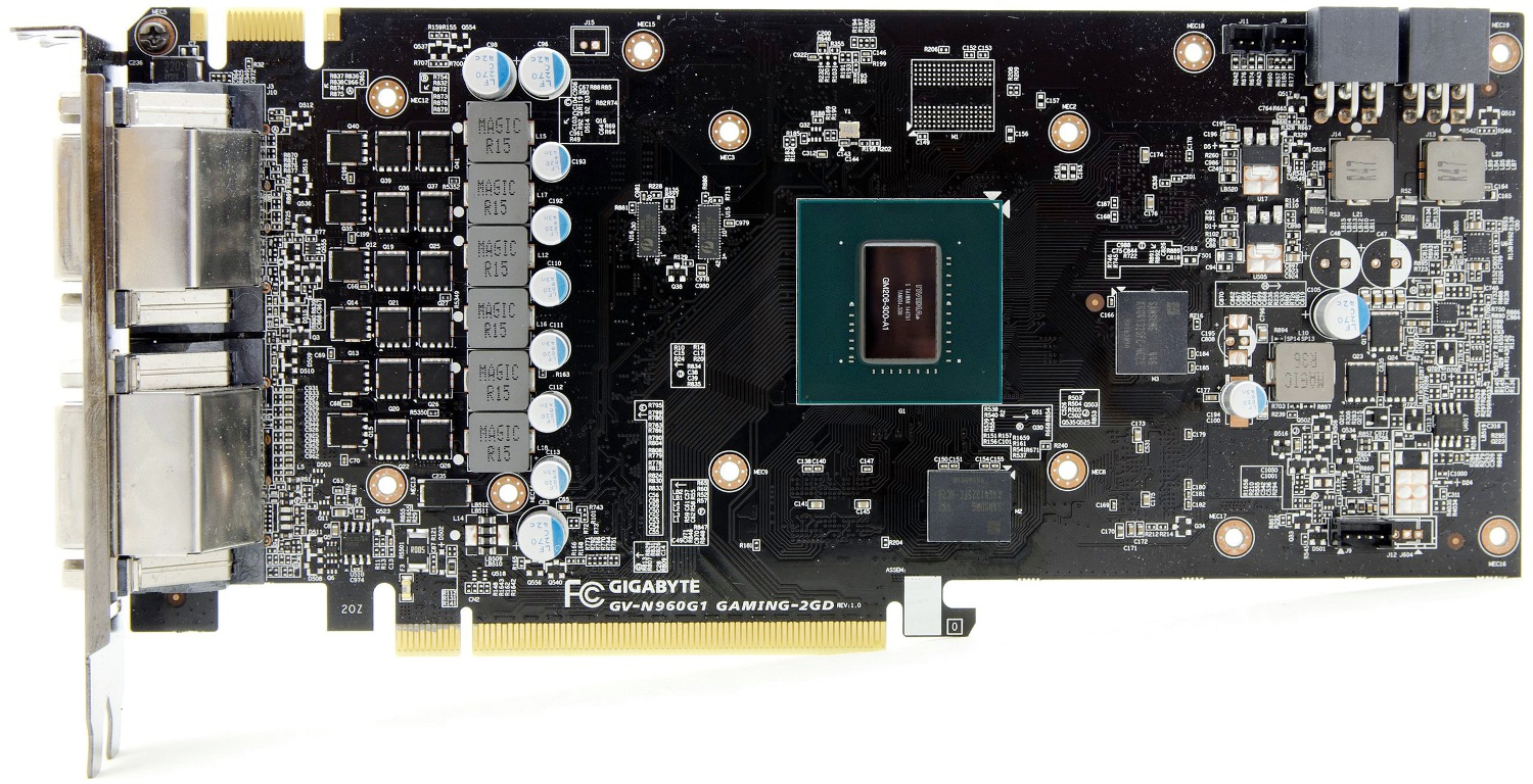 Память видеокарты (общим объемом 2 Гбайта) набрана с помощью четырех микросхем емкостью 512 Мбайт каждая, распаянных с обеих сторон печатной платы. Обмен данными между графическим ядром и памятью осуществляется через 128-битную шину. Именно за столь малую ширину шины и объем видеопамяти больше всего критикуют GeForce GTX 960 и не без основания: несмотря на высокий уровень производительности, в категории Full HD приходится жертвовать настройками графики для получения плавности картинки.