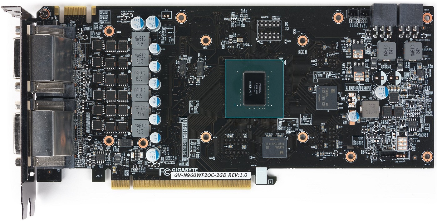 Большим достоинством модели является печатная плата, аналогичная Gigabyte GeForce GTX 960 G1 Gaming, лишь наклейка у коннектора PCI-E поменялась. Мы получаем все плюсы и минусы старшей версии, включая две микросхемы BIOS и два 6pin разъема дополнительного питания.