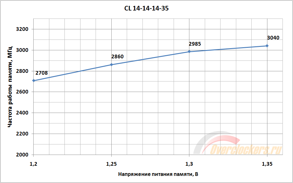 Продолжаем двигаться вверх по частотам, ослабляя тайминги. Пришло время проверить разгон при 14-14-14-35 и повторить эксперимент.