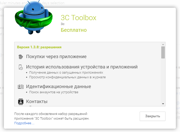 Что немаловажно – прописываются все разрешения, то есть те, что в Google Play не озвучены, или их смысл раскрыт не полностью. Честь и хвала разработчикам за это!