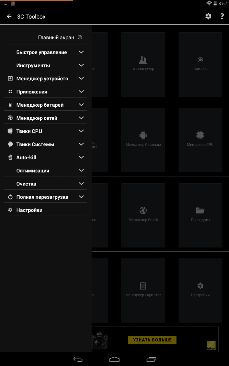 На этот раз первым пойдет 3C Toolbox, известный ранее как Android Tuner. Можно сказать, что это абсолютный универсал, поскольку программа предлагает широкий спектр возможностей для управления системой.
