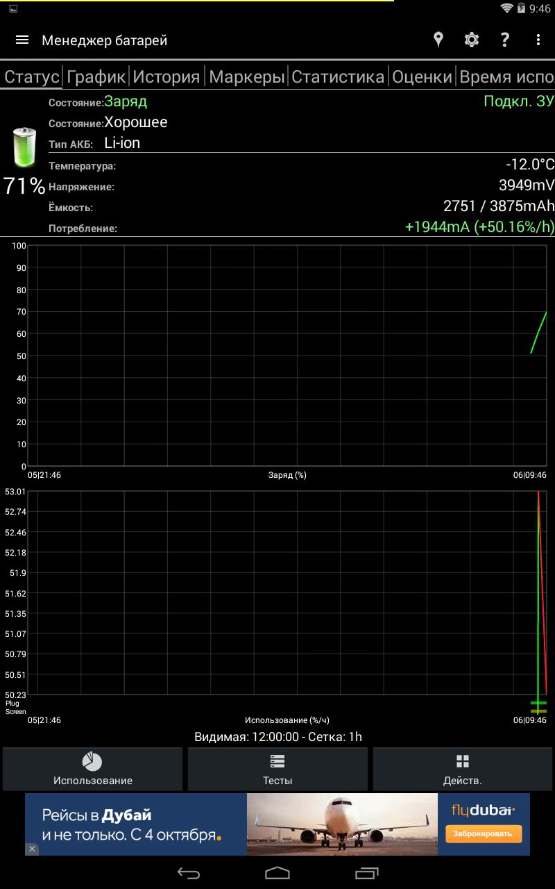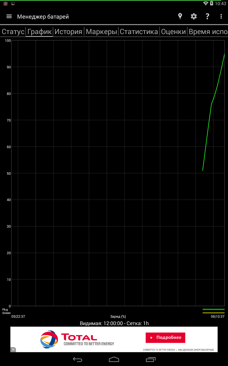 В следующей вкладке – «Оценка» - можно узнать время полного заряда устройства от сети и USB-порта. Также доступно время полного разряда при текущих параметрах, а также фактический заряд АКБ на текущий момент.