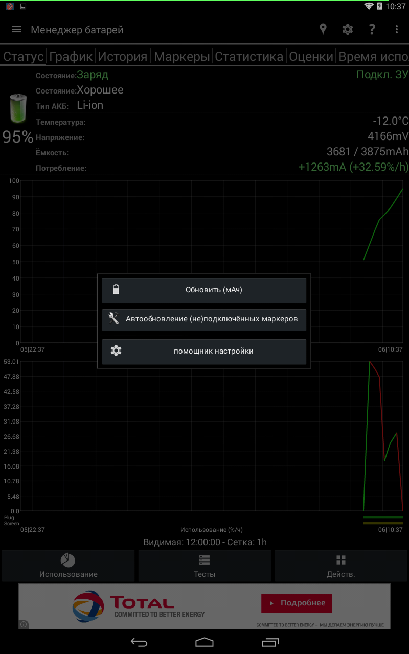 Но вернемся к нашей батарее. Можно обновить данные о емкости аккумулятора (вручную), сделать автообновление (Pro-версия) и открыть помощник настройки, что пригодится, если вы не сделали этого при первом запуске мастера батареи.
