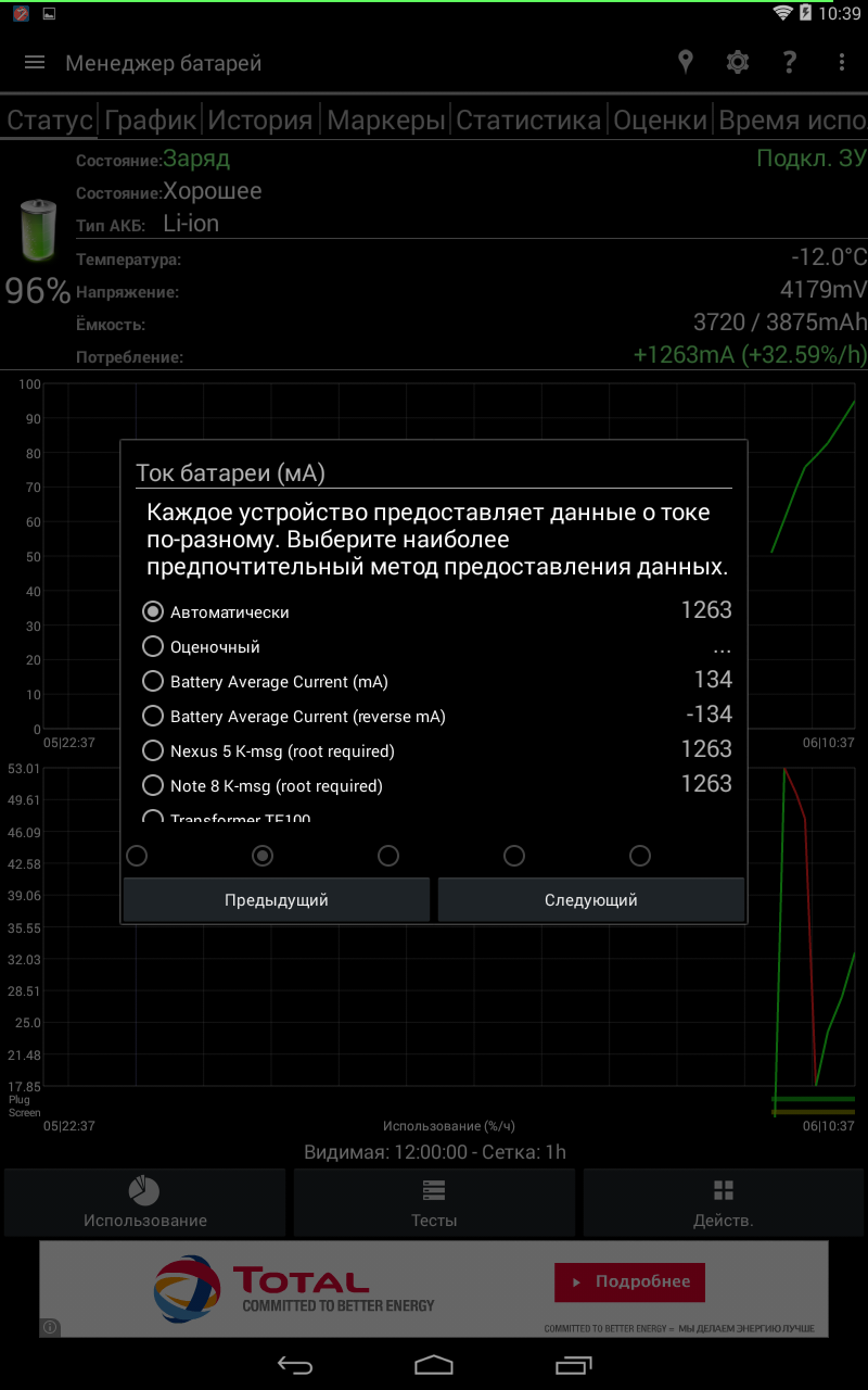 Здесь собрана информация о АКБ (во всплывающем окне), то есть нам наглядно показывают, на что мы бессовестно транжирим емкость батареи, а также последнее/оставшееся время до зарядки, реальную емкость на текущий момент, расход, температуру и напряжение. Если тапнуть по всплывающему окну, то можно получить более исчерпывающую инфу. При этом сначала предложат небольшой мастер предварительной настройки.