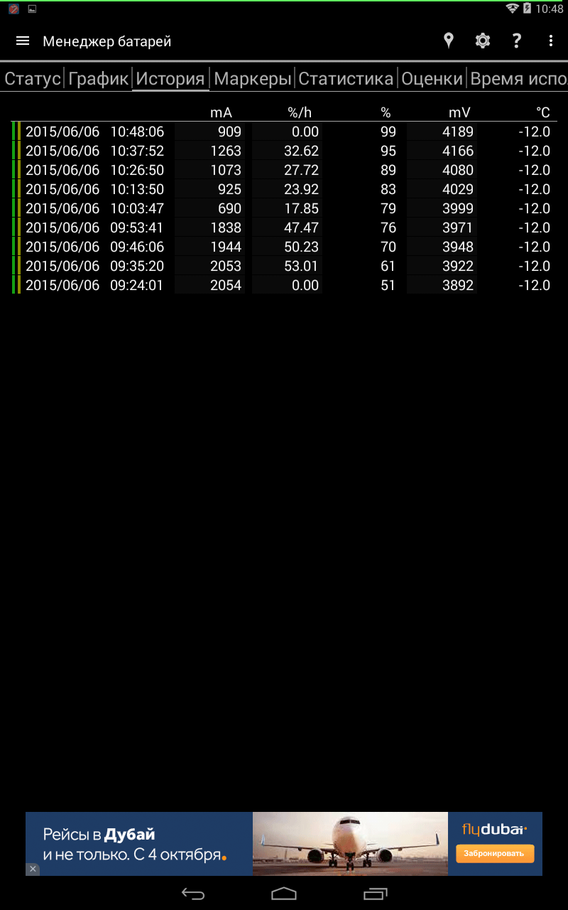 Тапаем на вкладку «История». Здесь представлена статистика аккумулятора, то есть 10-минутный замеры (интервал настраиваем в мастере) показателей температуры, емкости, напряжения, уровня заряда в процентах. Неплохой инструмент для тестировщика мобильных устройств.