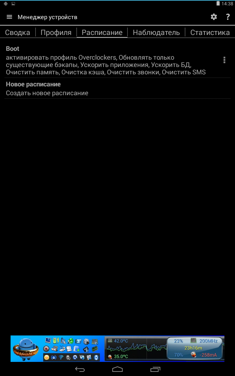 Создаем, или настраиваем профиль для наблюдений, а также параметризируем расписание. В последнем случае можно определить очередность задач, то есть когда и во сколько применять твики. Ниже собственно сами твики – бэкап всех приложений/SMS/журналов звонков, оптимизация запуска приложений и доступа к базе данных, очистка кэша, буфера, SMS и т.д.