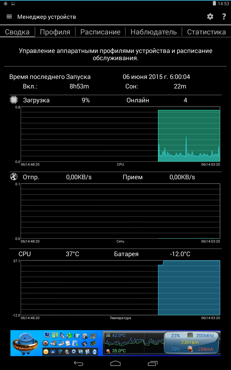 Статистика позволяет посмотреть параметры работы батареи, а сводка отображает график в реальном времени для загрузки процессора, скорости сети и температуры CPU и АКБ.