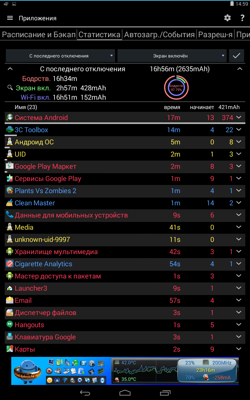 Ниже можно посмотреть использование батареи по версии Android, то есть сравнить показатели программы и системного решения. Кстати, статистика совпадает, а как же иначе.