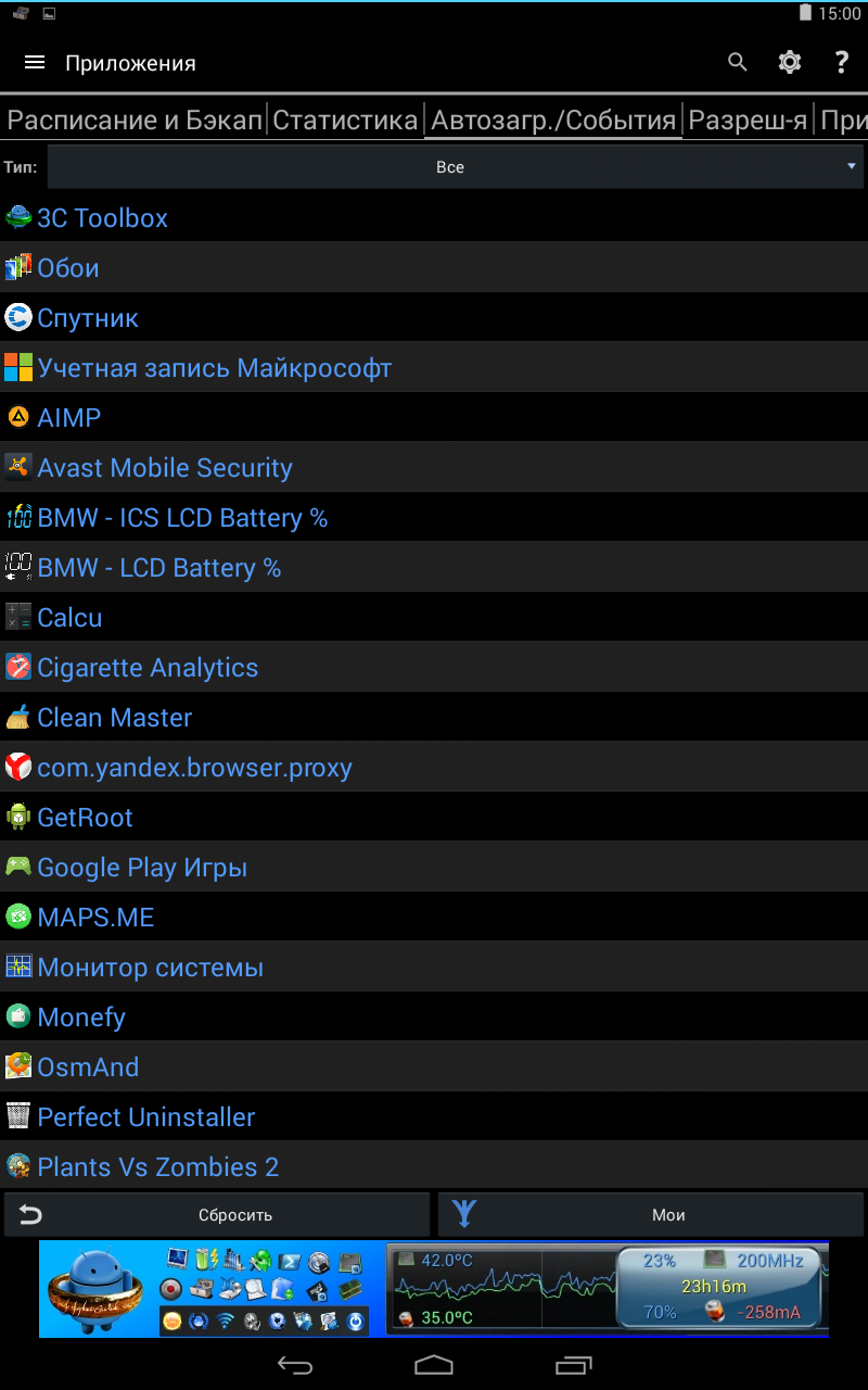 Завершающая вкладка – «бэкапы». Здесь собственно находятся все резервные копии. Также организована сортировка, где мы можем посмотреть только системные «бэкапы», «бэкапы» отдельные приложений и т.д.