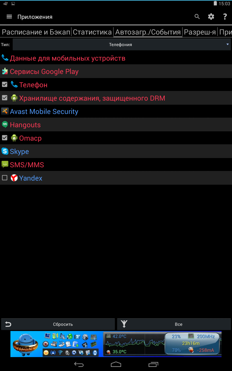 Для того, чтобы не потеряться в обширном перечне, предусмотрена сортировка по категориям, например, приложениям отвечающим за телефонию или сеть.
