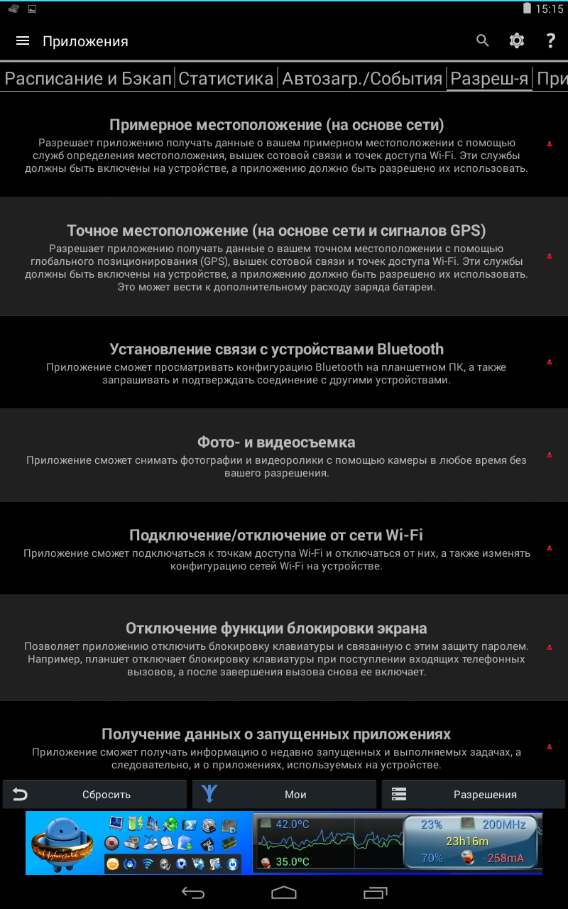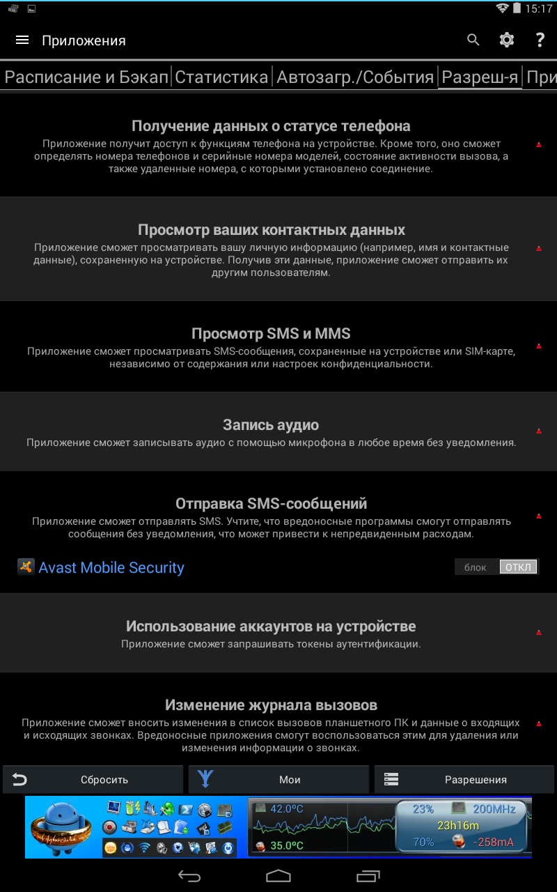 Та же песня с разрешениями. Представлены все категории разрешений, тапнув на которые, можно открыть привязанные к ним программы. А, что, очень удобно. Например, можно разом узнать, какие «товарищи», например, могут отправлять SMS. Иногда это очень помогает заранее изобличить вирусную программу.