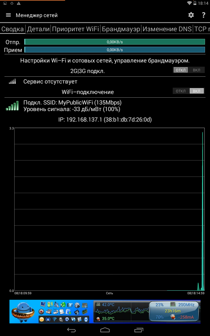 Итак, для нас доступна общая сводка, то есть скорость приема/передачи данных, уровень сигнала и максимальная скорость 2G|3G или Wi-Fi, а также график работы сети в реальном времени.
