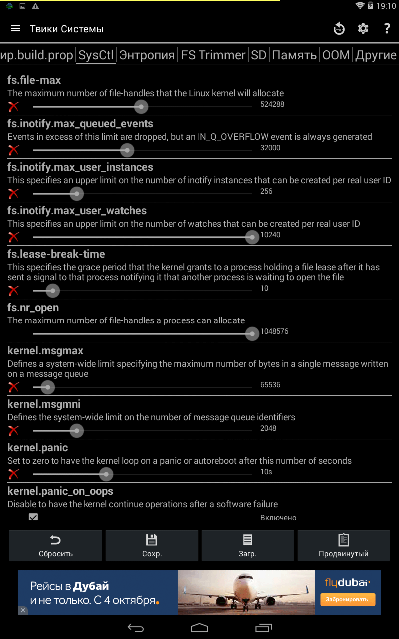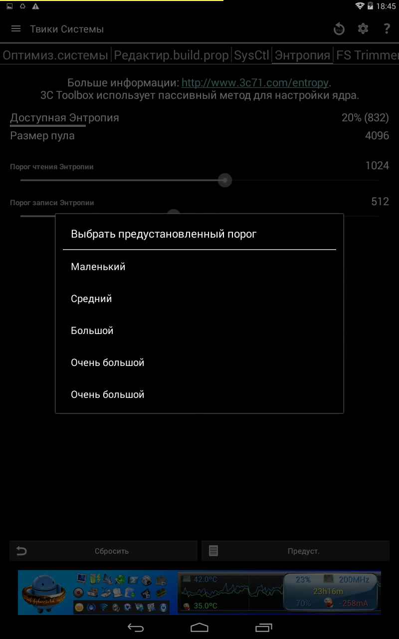 Здесь, прежде всего, настраиваем энтропию, то есть ускоряем отзывчивость устройства и ускоряем запуск программ. При этом, чтобы не мучаться с ползунком, предусмотрены четыре предустановки порога чтения/записи энтропии: маленький, средний, большой и очень большой. Сама программа использует пассивный метод для настройки ядра.