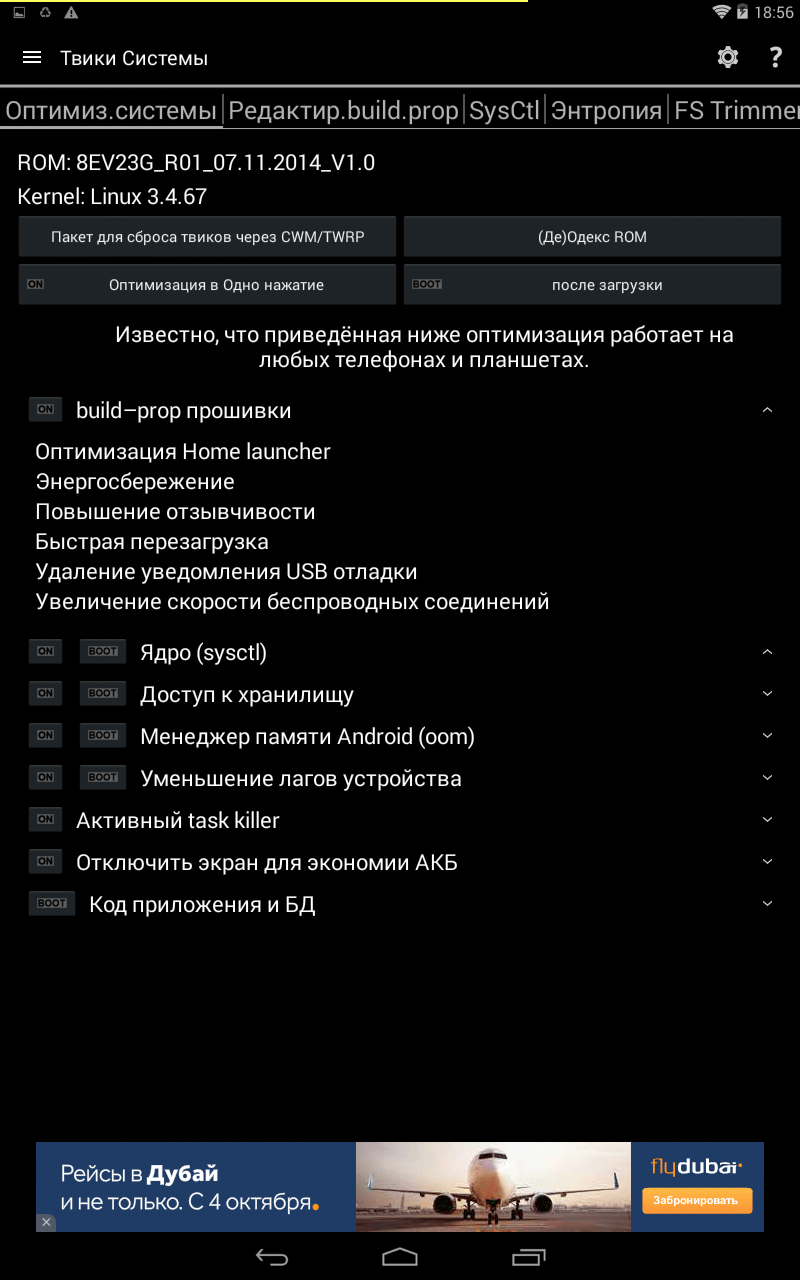 Оптимизация системы также реализовано очень серьезно. При этом можно оптимизировать все одним нажатием. Например для прошивки можно оптимизировать лаунчер, энергосбережение, отзывчивость. Для ядра – только энергосбережение, отзывчивость и т.д.
