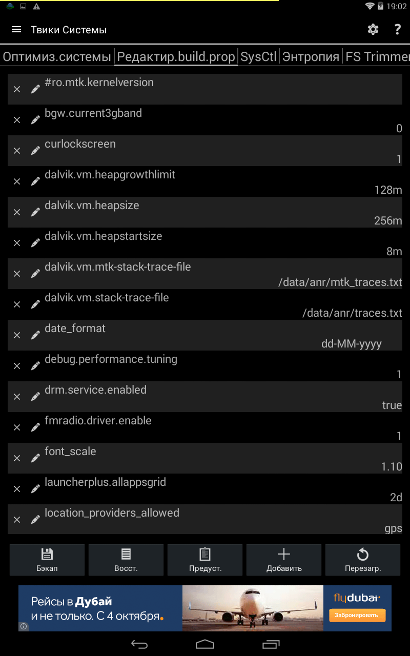 В следующей вкладке редактируем «.build.prop». Благоразумно в нижнем сайдбаре для этого предусмотрен «бэкап», который стоит сделать перед тем, как ковыряться в «давликах» и «провайдерах». Также здесь можно добавить свои ключи и выбрать предустановки, например, отключить уведомления отладки USB, анимацию при загрузке или вовсе изменить название устройства.