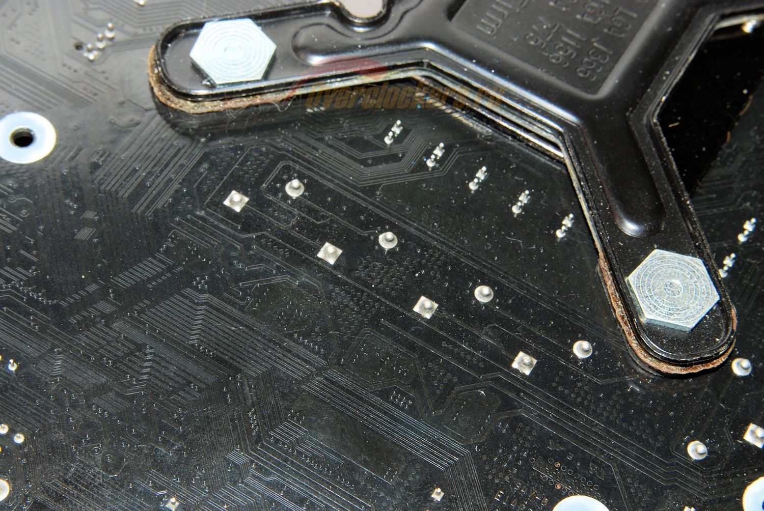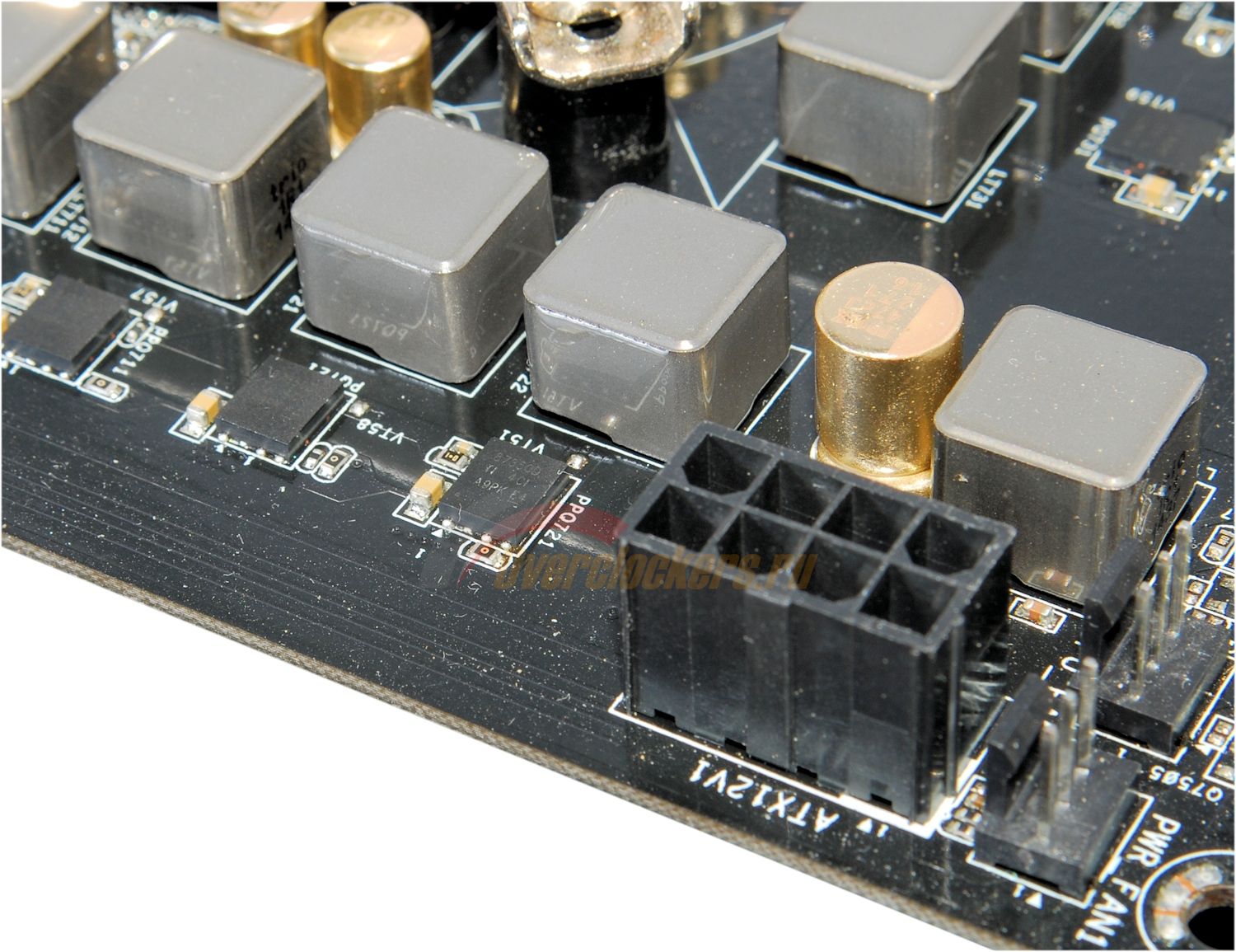 Подсистема питания ЦП построена по четырехфазной схеме с удвоенным набором элементов: выводы дросселей с обратной стороны платы спаяны попарно.