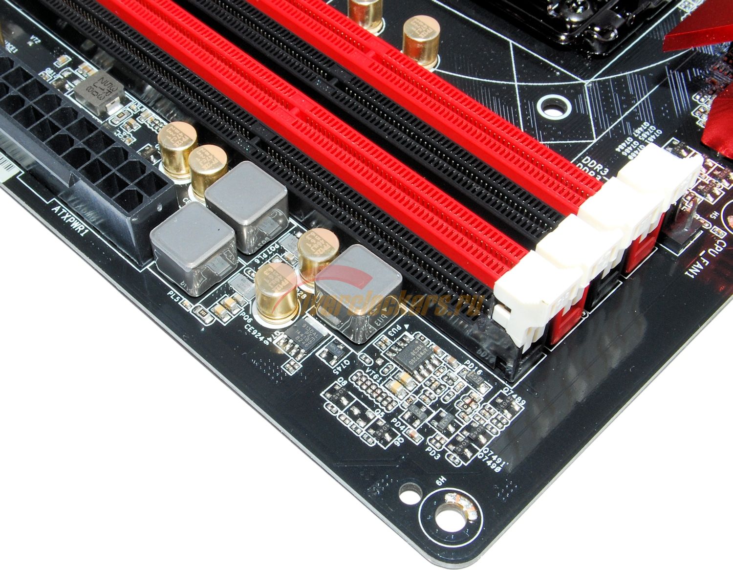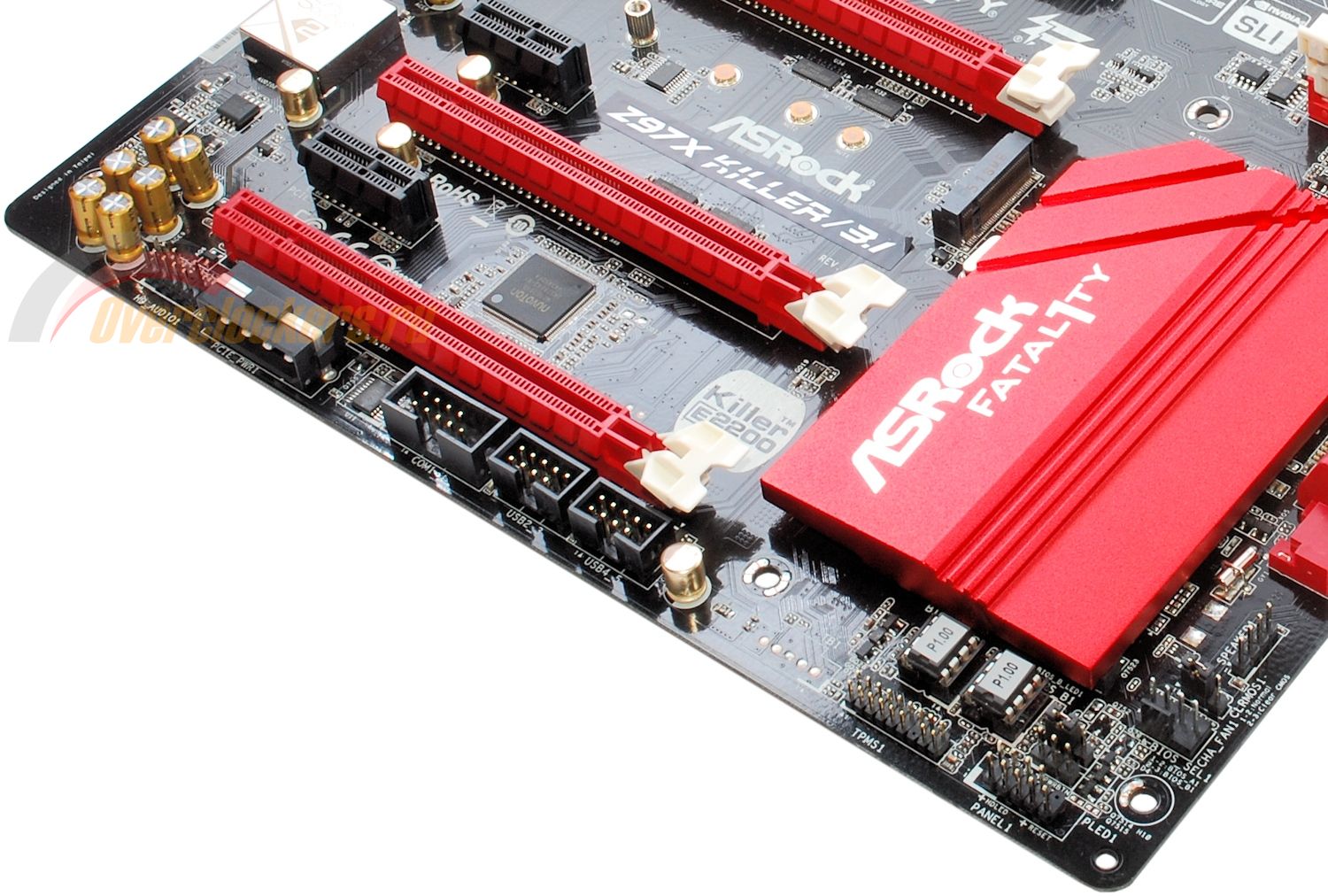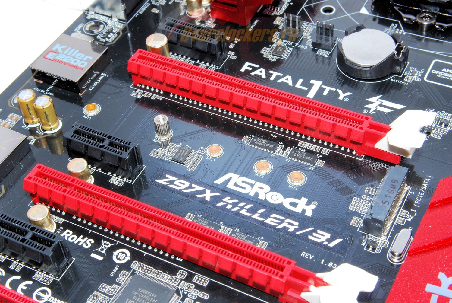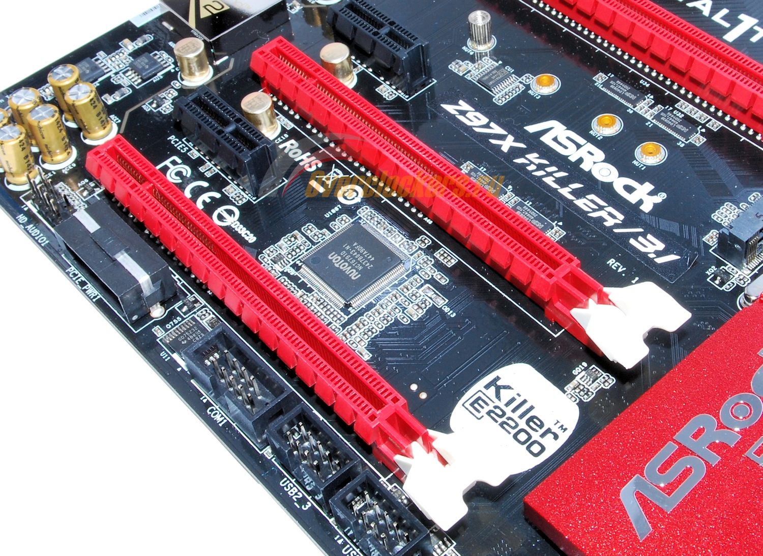 И присутствует все та же полоса пустого текстолита без токопроводящих слоев, которая теоретически должна обеспечивать защиту от наводок. С ним соседствует гигабитный сетевой контроллер Qualcomm Atheros Killer E2200, накрытый своей декоративной металлической крышкой.