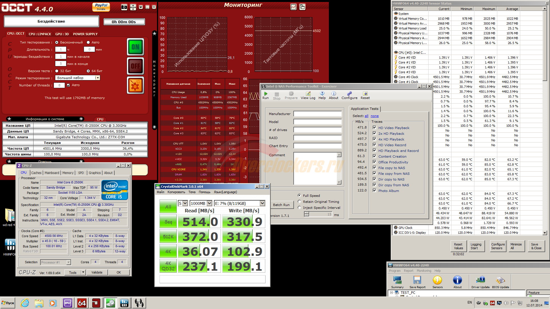 Ведь задачей является тестирование накопителей, а не процессора, поэтому нагрузка на него далека от максимальной (пиковые всплески нагрузки крайне непродолжительны) и проблем с перегревом, которые дали бы о себе знать при запуске Prime или LinX, попросту не возникает.