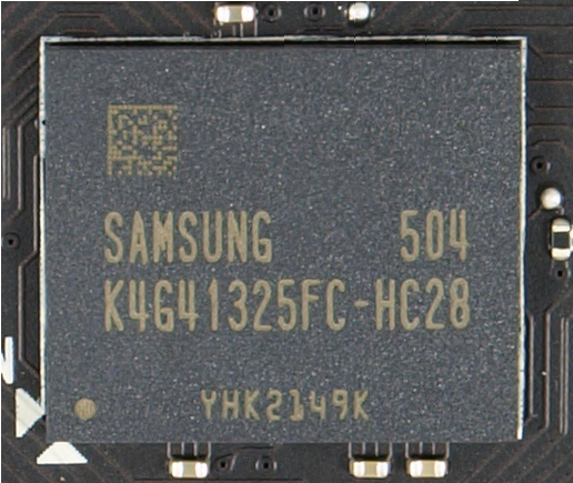 На печатной плате распаяно четыре микросхемы видеопамяти типа GDDR5 по 512 Мбайт каждая производства Samsung с маркировкой K4G41325FC-HC28 (расшифровка) и с шиной обмена данных 128 бит, что дает общий объем в 2 Гбайта. Паспортная частота соответствует эталонному значению и составляет 1753 МГц (эффективная частота 7012 МГц).