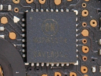 Термопрокладка «разъела» надписи на микросхеме, но сомневаться не приходится: перед нами ШИМ-контроллер uP1608TK, который обеспечивает активное переключение фаз для понижения уровня энергопотребления видеокарты.
